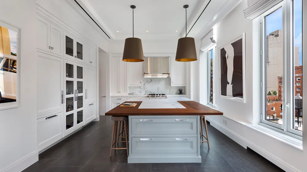 Accessed via a private elevator landing, the apartment opens to a welcoming entry foyer that leads into a 26-by-25-foot great room anchored by a striking floor-to-ceiling marble fireplace. Pocket doors reveal the corner dining room, while the adjacent Bakes & Kropp eat-in kitchen features radiant heated floors, a central island, top-tier appliances, and bespoke cabinetry. Every window is fitted with motorised shades and linen drapery, combining technology with timeless design.