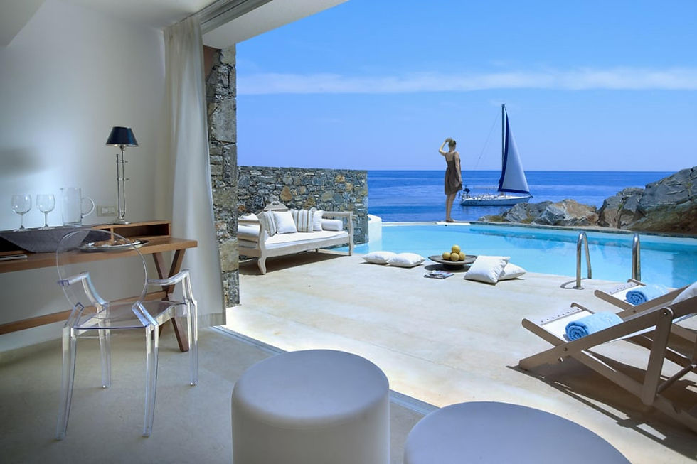 Infinity pools spill toward the Aegean Sea, while understated interiors let the views do the talking. Ideal for couples seeking privacy without isolation.
