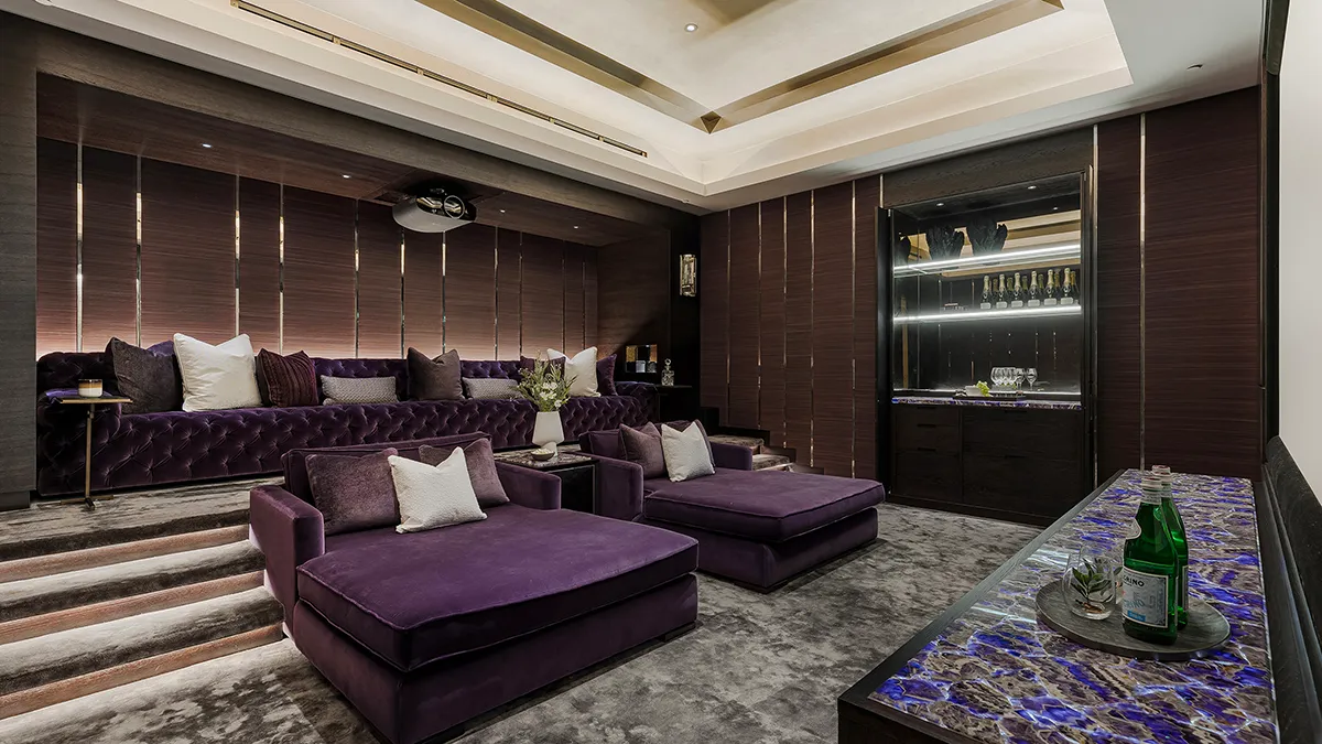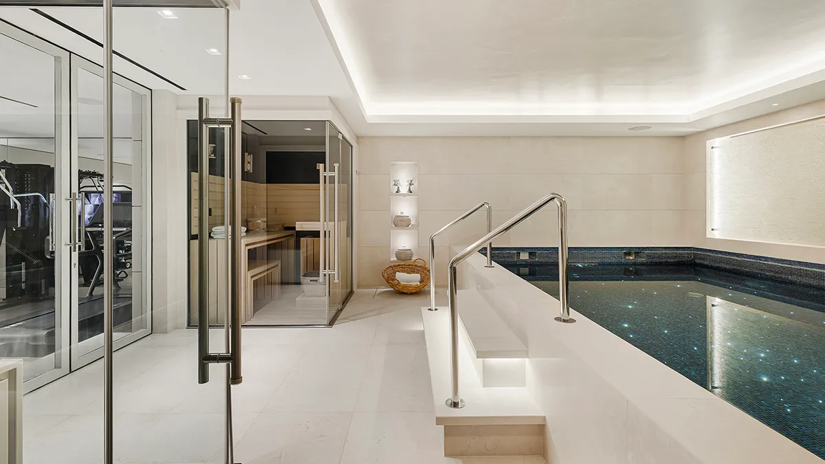 A private cinema room with bar seating, a secondary kitchen, pantry and playroom occupy the lower ground floor, while the level beneath is dedicated entirely to wellness. Here, you’ll find a gym, indoor pool, sauna and steam room, bringing a private members’ club experience into the home.