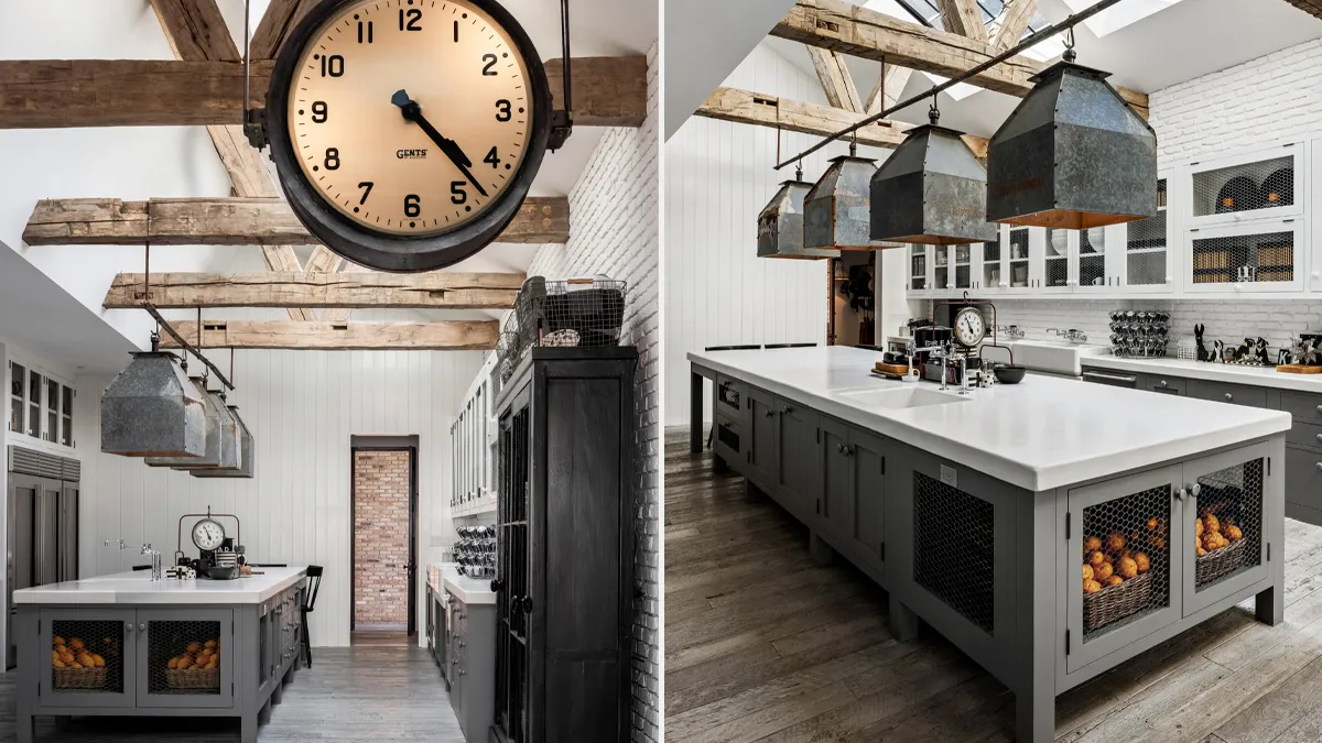 The main living area features a fireplace etched into a whitewashed brick wall, soaring wood-beam ceilings, and large metal pendant lights. Additional highlights include a formal dining room, a bookshelf-lined library with a rolling ladder, dual primary suites, and a sky-lit kitchen complete with a blue-grey island, matching cabinetry accented with chicken wire, a tall Sub-Zero cooler, and a walk-in pantry.
