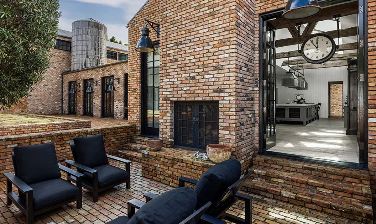 The estate is constructed with 75,000 reclaimed clay bricks Keaton personally selected and shipped from Chicago, topped with a steel roof and a silo. Inside, the home offers five bedrooms and seven bathrooms, across two levels filled with hardwood, brick, and stained concrete floors, French and sliding barn doors, and steel-framed commercial windows flooding the home with natural light.