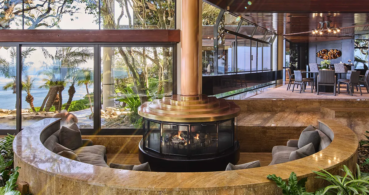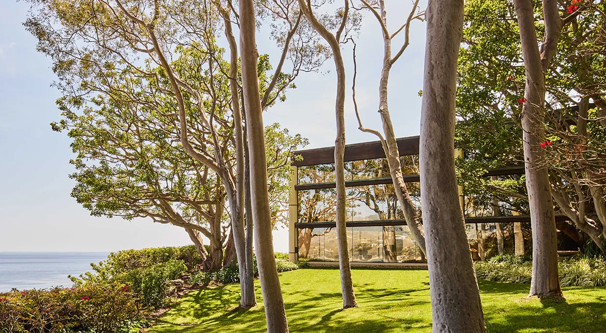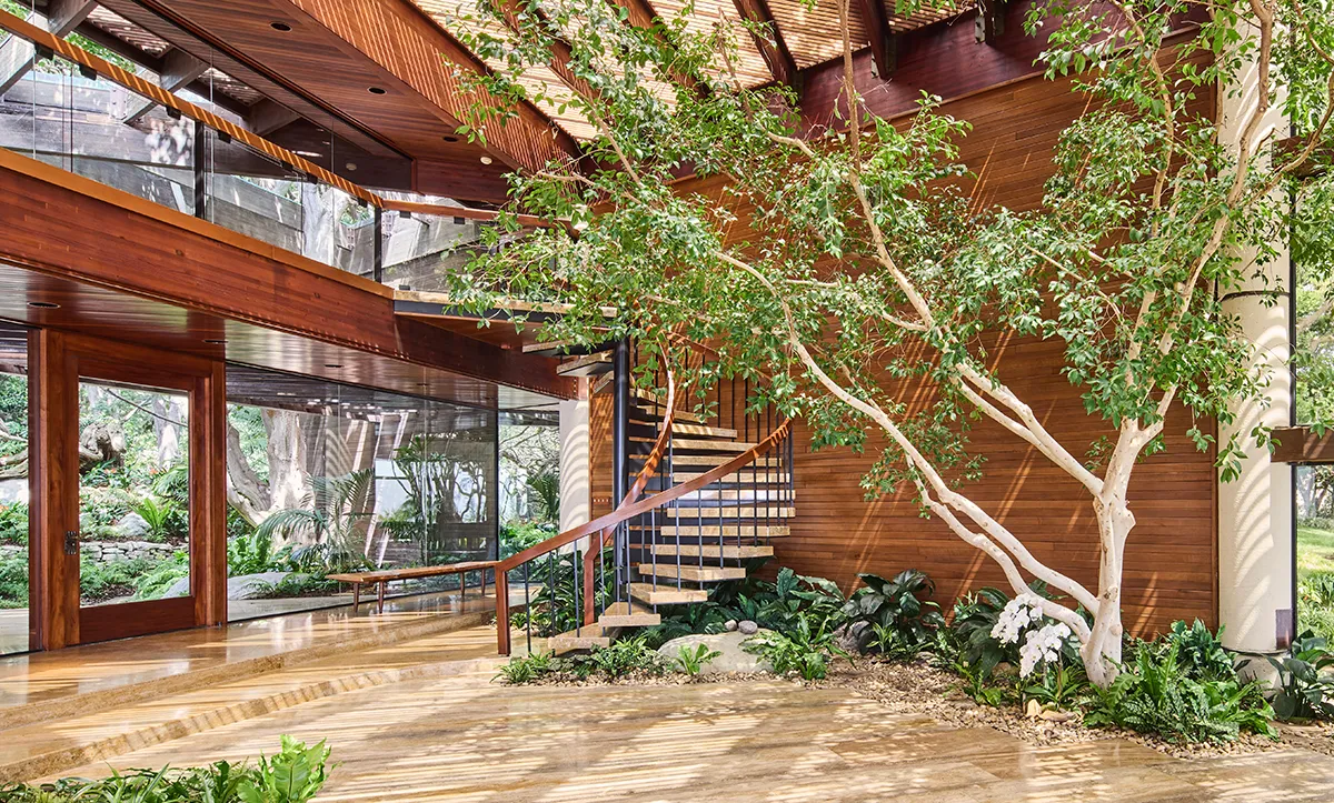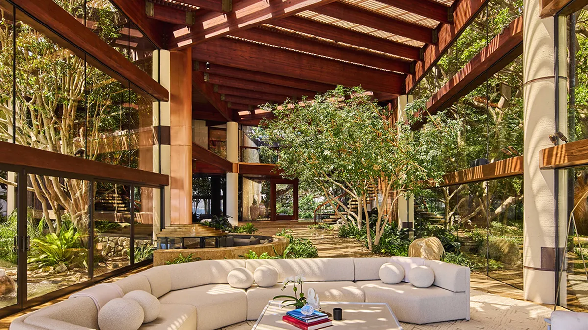 At the heart of the estate is a striking triangular home designed by renowned modernist architect Ed Niles. Resting dramatically on a cliff edge, the three-storey residence spans 7,100 square feet and opens with an atrium entry featuring mature trees. The soaring 30-foot wood and glass ceiling crowns a vast entertaining space complete with a sunken copper and glass fireplace, while doors lead out to a koi pond and expansive ocean-view terraces.
