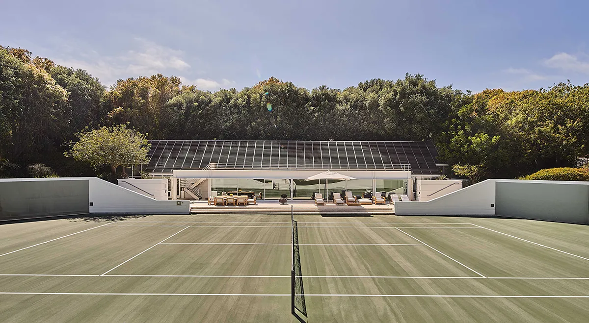 Outdoors, the grounds are a true private resort: a saltwater pool with a waterfall grotto, spa, sauna, and cold plunge sit among manicured gardens. Across the road, a championship tennis court is accompanied by a 2,700-square-foot pavilion boasting guest suites, a fireside lounge, a full kitchen, and sauna-equipped locker rooms. Completing the compound are a guesthouse, greenhouse, orchard, and aviary.