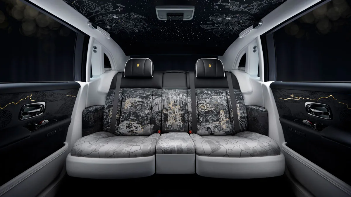 The rear-seat embroidery is the car’s defining feature — a breathtaking tapestry created from 77 hand-drawn sketches and 45 individual panels. Each panel captures a moment in Phantom’s legacy, researched over five months by the Bespoke design team and an in-house historian.